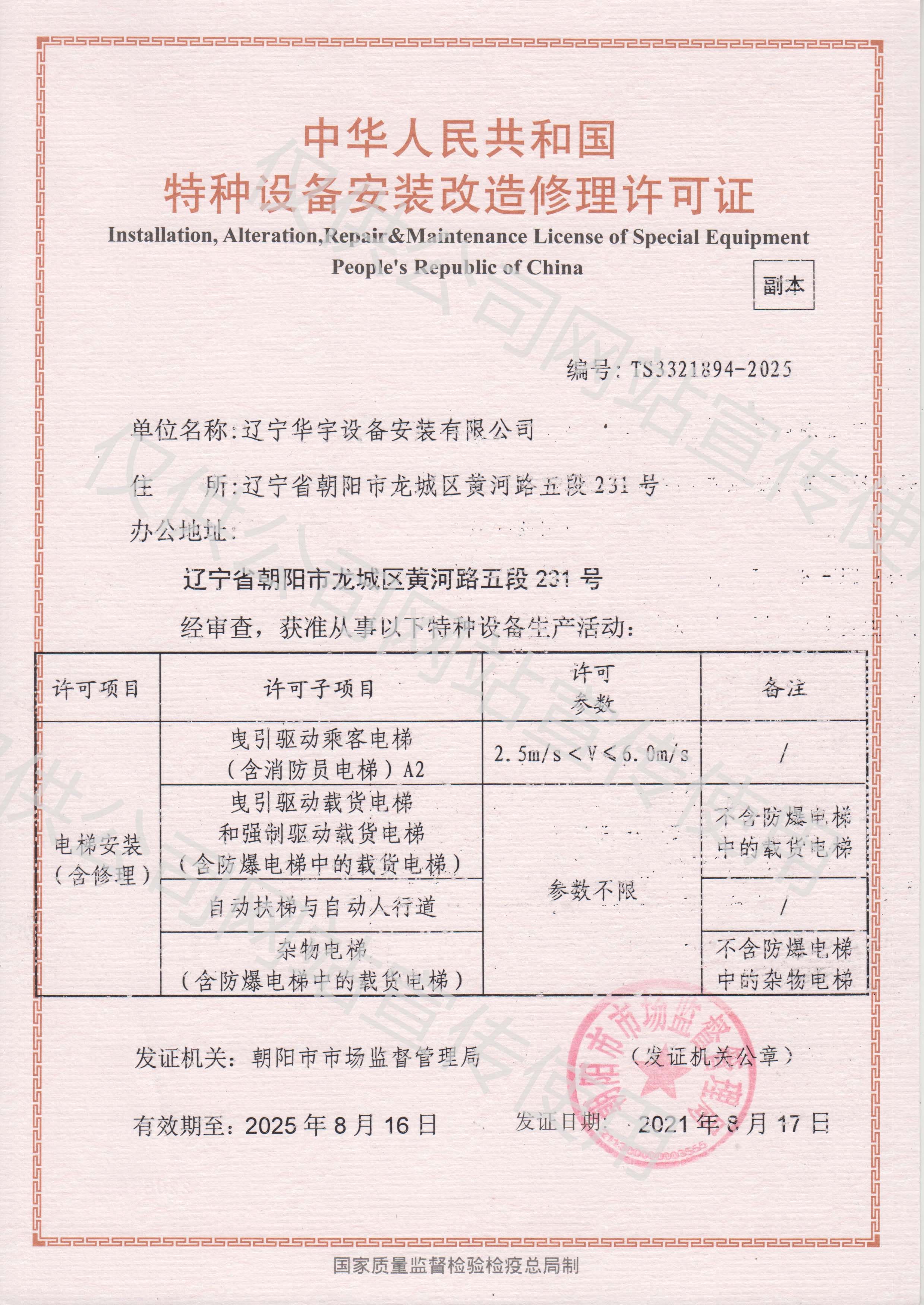 ? ? ? ?? 遼寧華宇設備安裝有限公司成立于2002年7月15日,注冊資金10000萬。公司占地面積60余畝,建筑面積4000余平?,F取得消防設施工程專業承包一級資質、消防設施維護保養檢測一級資質、建筑機電安裝工程專業承包一級資質、電子與智能化專業承包二級、建筑裝修裝飾工程專業承包二級、安全技術防范設施設計施工二級資質、建筑工程施工總承包三級、電力工程施工總承包二級、輸變電工程專業承包二級資質、電力承裝、承修、承試三級資質、鋼結構工程專業承包三級資質和地基基礎工程專業承包三級。同時是人防工程通風(防化)設備生產安裝企業,并具備電梯銷售、電梯安